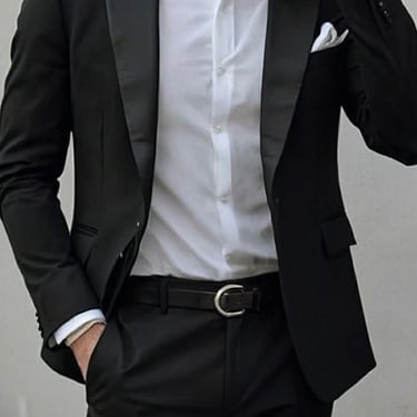Juodos kostiuminės kelnės ir balti marškiniai, juodas kostiumas, smokingas